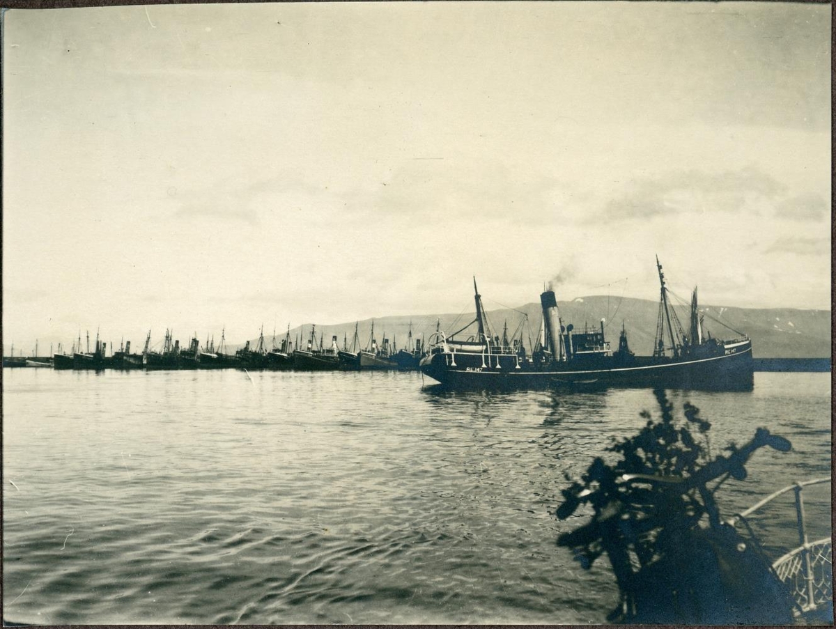 Frá Reykjavíkurhöfn. Í forgrunni er gufutogari á hægri siglingu og á kinnungnum og við skut má sjá stafina RE 147. Fjöldi sambærilegra togara liggur við bryggju í baksýn.