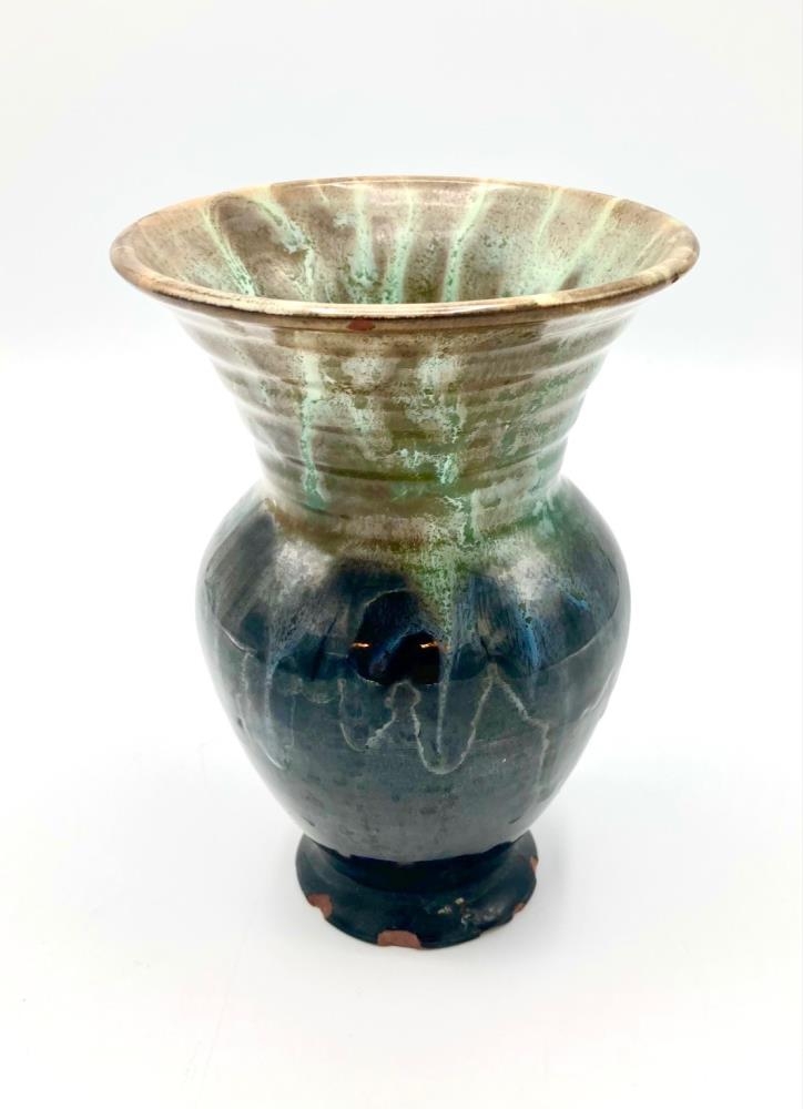 Vasi, blómavasi eftir Guðmund frá Miðdal. Vasinn er úr jarðleir með dökkum glerungi að utan en grænleitum hlaupaglerungi að innan og út fyrir barma. Lítillega brotið út úr fæti.