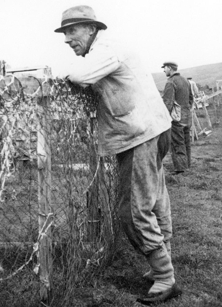 Guðlaugur Sveinsson bóndi lýtur yfir búfé sitt, sem ekki sést, hendur hans hvíla á tvöfaldri járngirðingu sem haldið er uppi af tréstaurum. Guðlaugur er íklæddur ljósum vinnujakka, dökkum buxum og stígvélum með ljósan hatt á höfði. Í bakgrunni stendur maður með sixpensara á kolli íklæddur dökkum samfestingi. Enn fjær, hinum megin girðingarinnar er maður með ljóst höfuðfat í ljósum vinnujakka er snýr baki í myndavél.