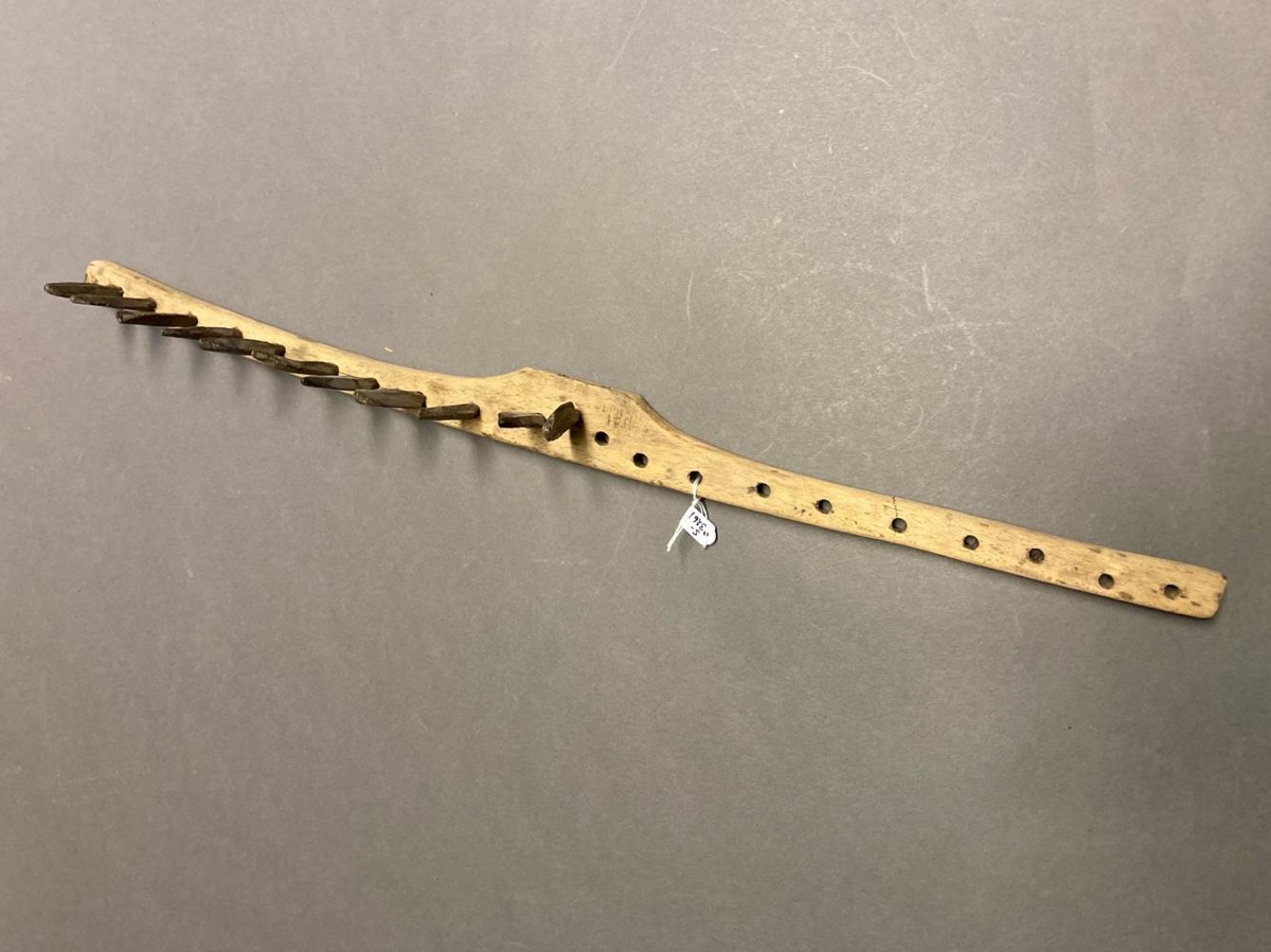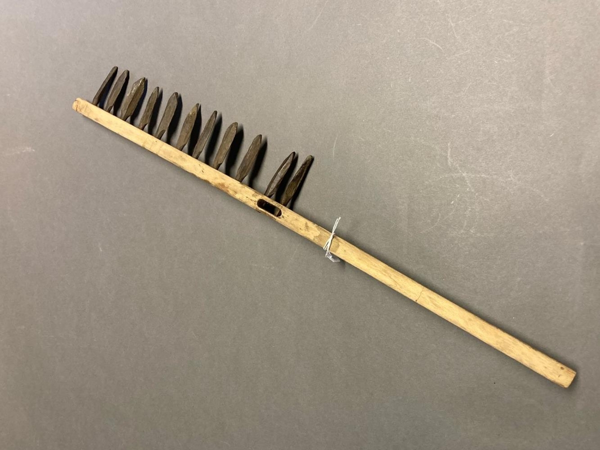 Hrífuhaus með 11 tindum. Er án skafts og vantar nokkra tinda sem eru úr brúnspón. Afhendendur eru Tinna Jóhannsdóttir (131172-3119) og Orri Páll Jóhannsson (190578-3999). Notandi Jóhann Sigurðsson, Bakkakoti Meðallandi eða Jóhannes Guðmundsson Herjólfsstöðum. Ekki vitað hver bjó til. L 59,5 cm. Kom 25.7.2021.