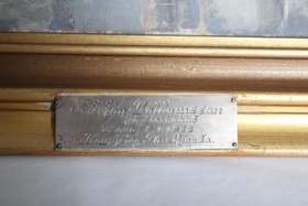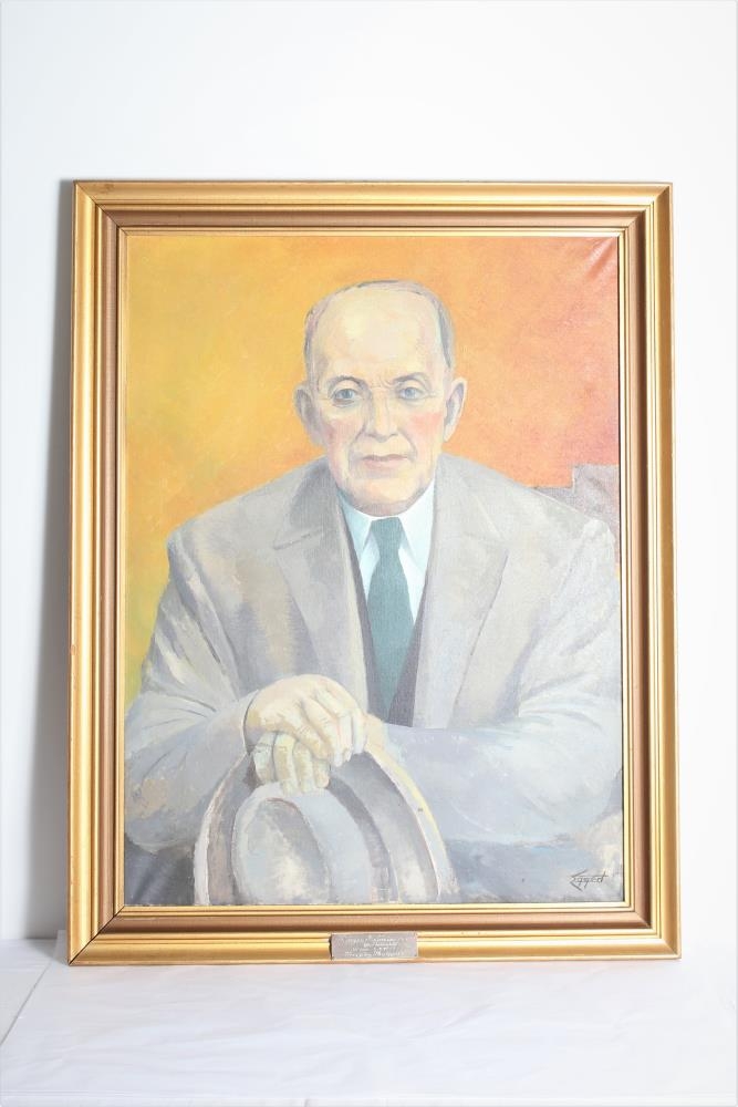 Málverk í gylltum ramma af manni í jakkafötum sem á að vera Stefán Baldvinsson frá Stakkahlíð, Loðmundarfirði. Silfurplata er fyrir miðju neðst á rammanum og á henni stendur "Stefán Baldvinsson frá Stakkahlíð, 75 ára, 9.1.1958, Kaupfélag Austurfjarða". Undirritað af málara neðst í hægra horni - "Eggert".