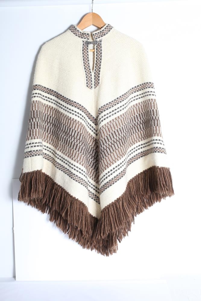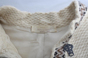 Ofin slá með rósabandsvefnaði. Hvít með fallegu brúnu munstri frá miðju og niður. Neðst er brúnt kögur úr lopabandi. Líning er í hálsmáli og niður á bringu og ein smella til að loka henni í hálsi. Gert af Kristínu Bárðardóttur frá Eskifirði. Vigdís Júlíana Björnsdóttir, móðir gefanda, átti slánna.