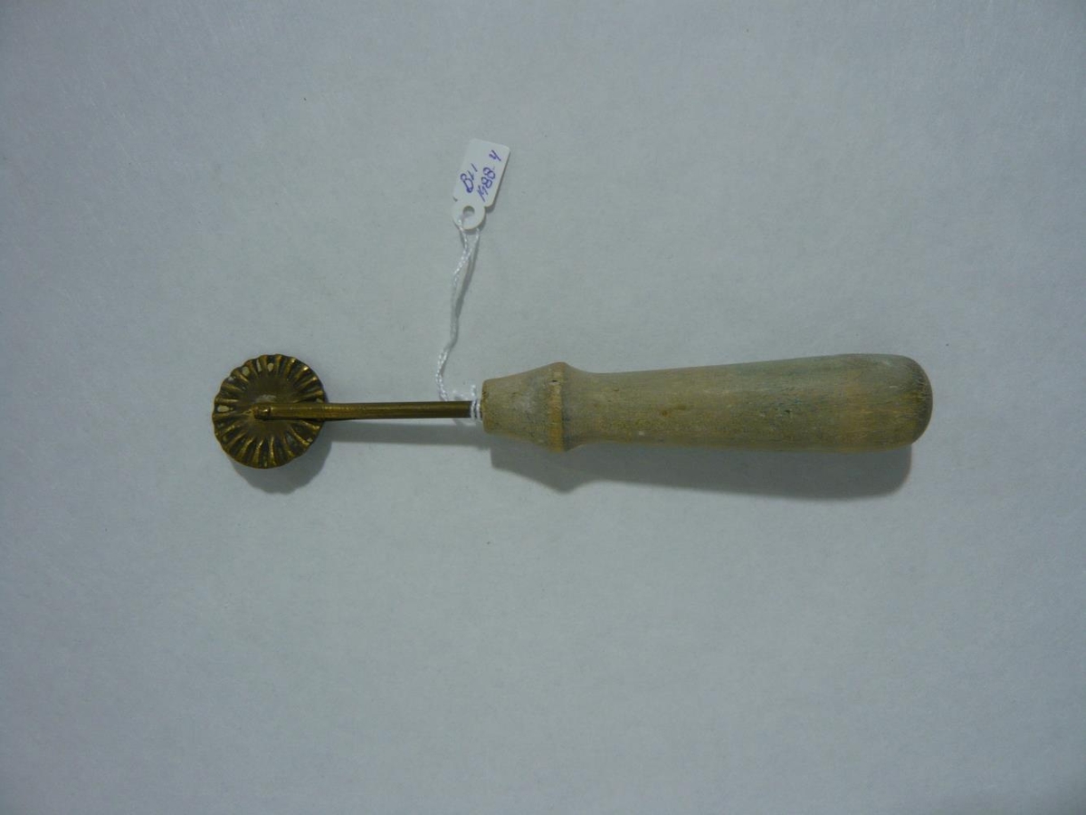 Kleinujárn, þ.e. tréskaft og málmteinn með hjóli fremst, til að skilja að segið í hverja kleinu eftir að búið er að hnoða það og fletja út. Skaftið er 10 cm á lengd en hitt 6,5 cm.