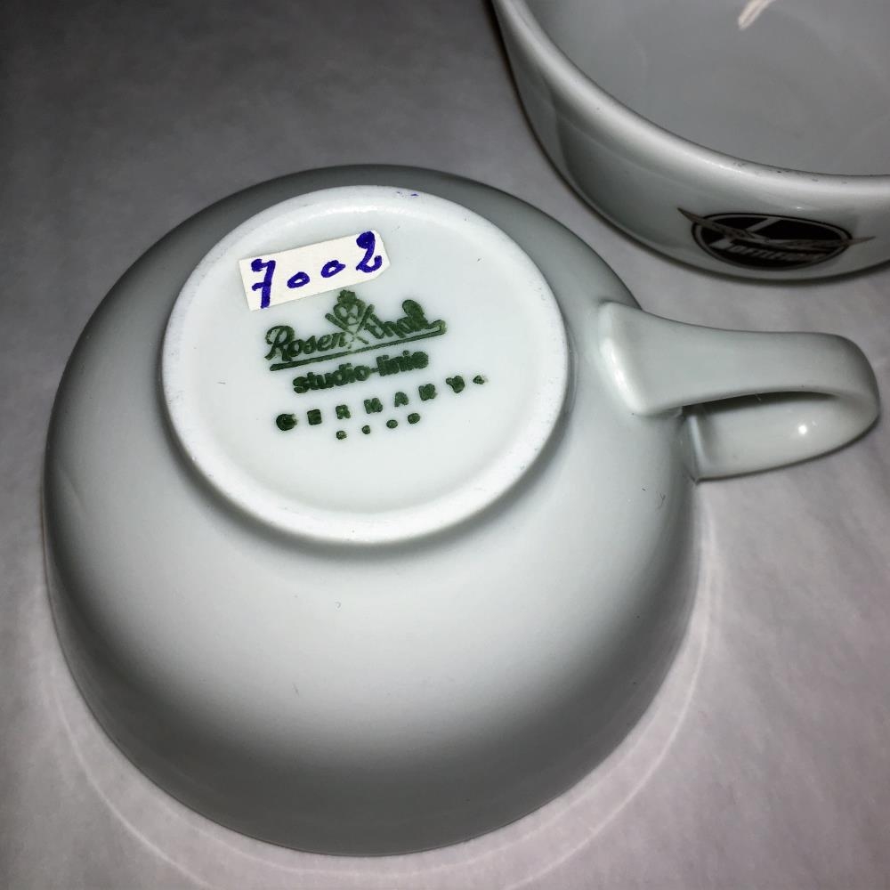 Fjórir kaffibollar án undirskála, Rosenthal. Studio Line. Germany. Hvítir með merki Loftleiða í brúnum lit. Gefandi Þorgeir Hafsteinsson, Hálsaseli 12, Reykjavík