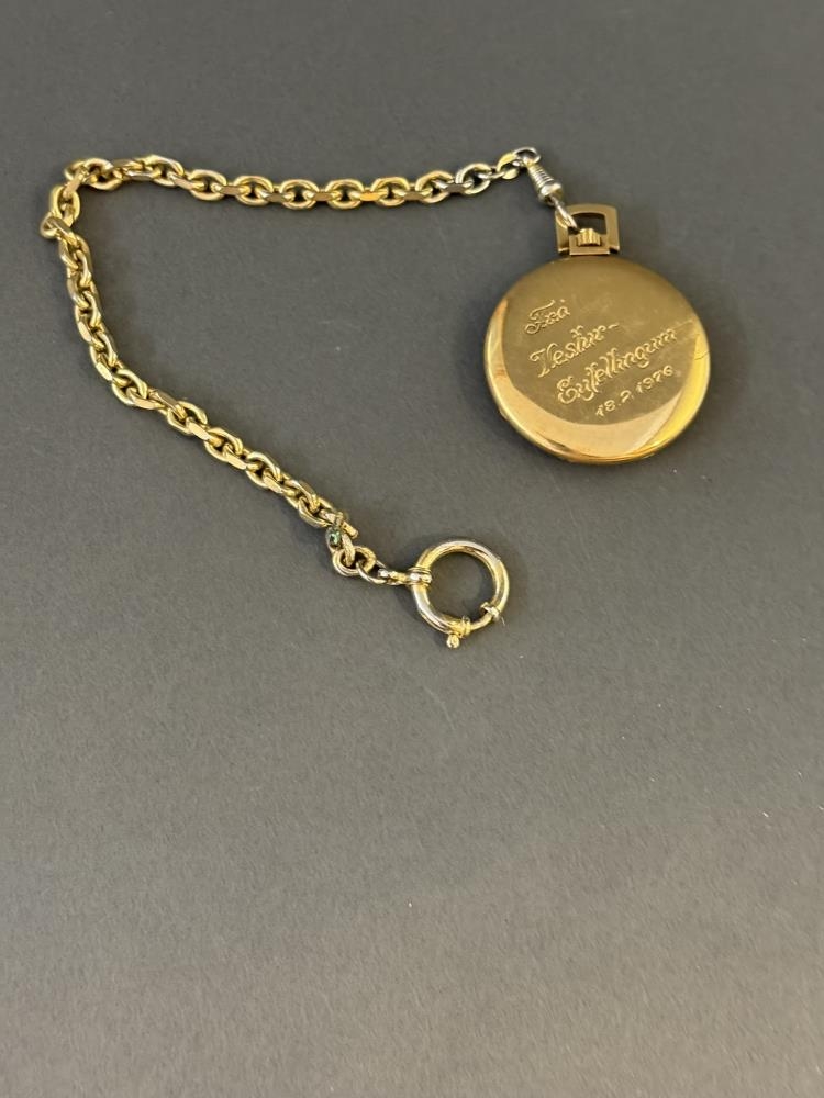 Gullúr með áletrun: (2) " FRÁ VESTUR- EYFELLINGUM 18.2.1976" (1) HARALDUR PÁLSSON SMIÐUR" Úr dánarbúi Haralds Pálssonar trésmiðs sem vann Eyfellingum af mikilli dyggð um áratugi og fyrir nær ekkert kaup. Hann dó í febrúar 1981.