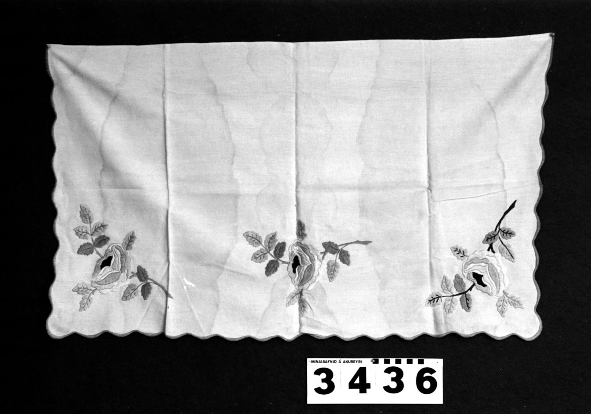 og eru þær á greinum með laufblöðum á. Utan með dúknum á þrjá vegu eru