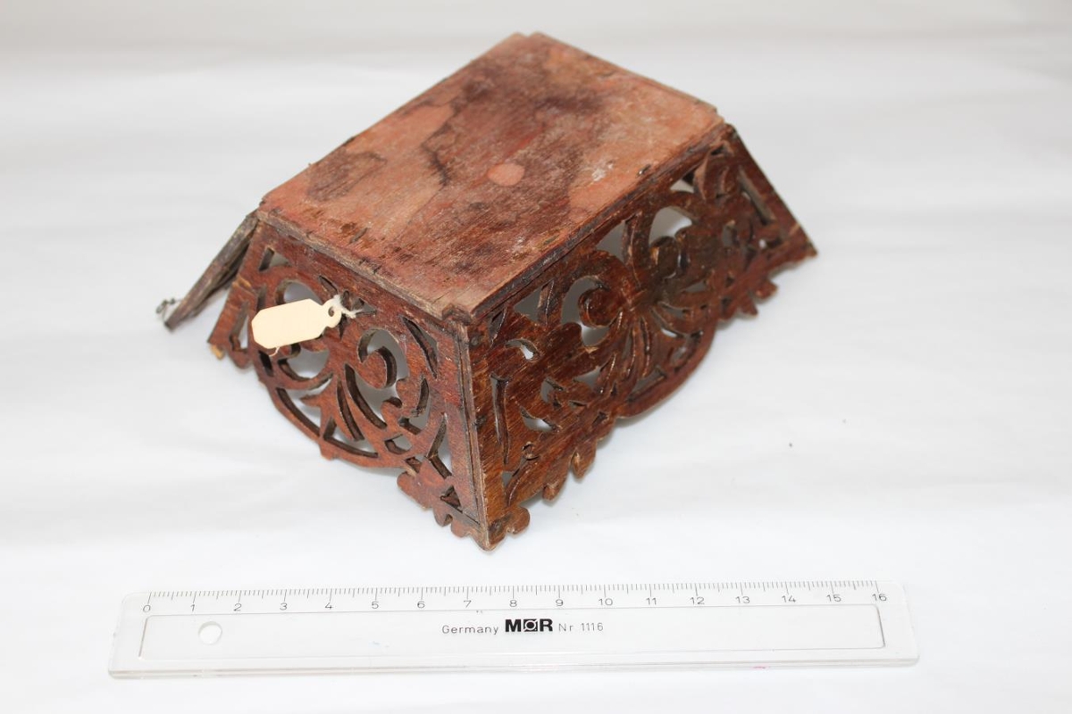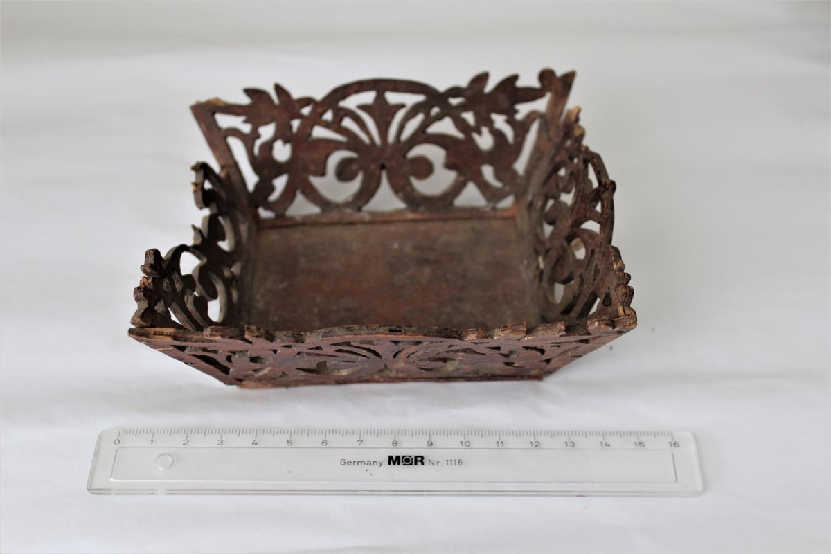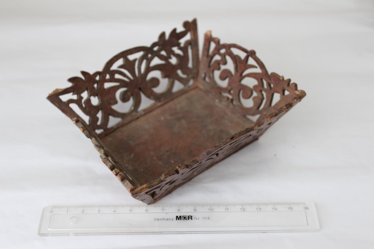 Skrauttrog útsagað úr krossviði af Sigurþóri Ólafssyni á Gaddstöðum. Lengd v.barm 13,3cm.,breidd 11cm., lengs botns 9,8cm., breidd 7cm., brotið úr öðrum gafli. Sigurþór gerði mikið að því að saga út í krossvið.