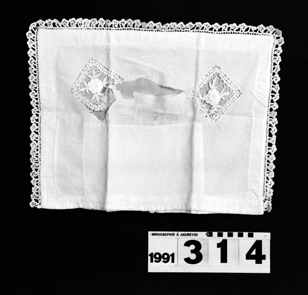 hvítu lérefti. Meðfram brúnum á þrjá vegu er hekluð blúnda og framan á
