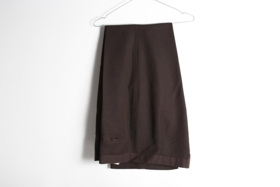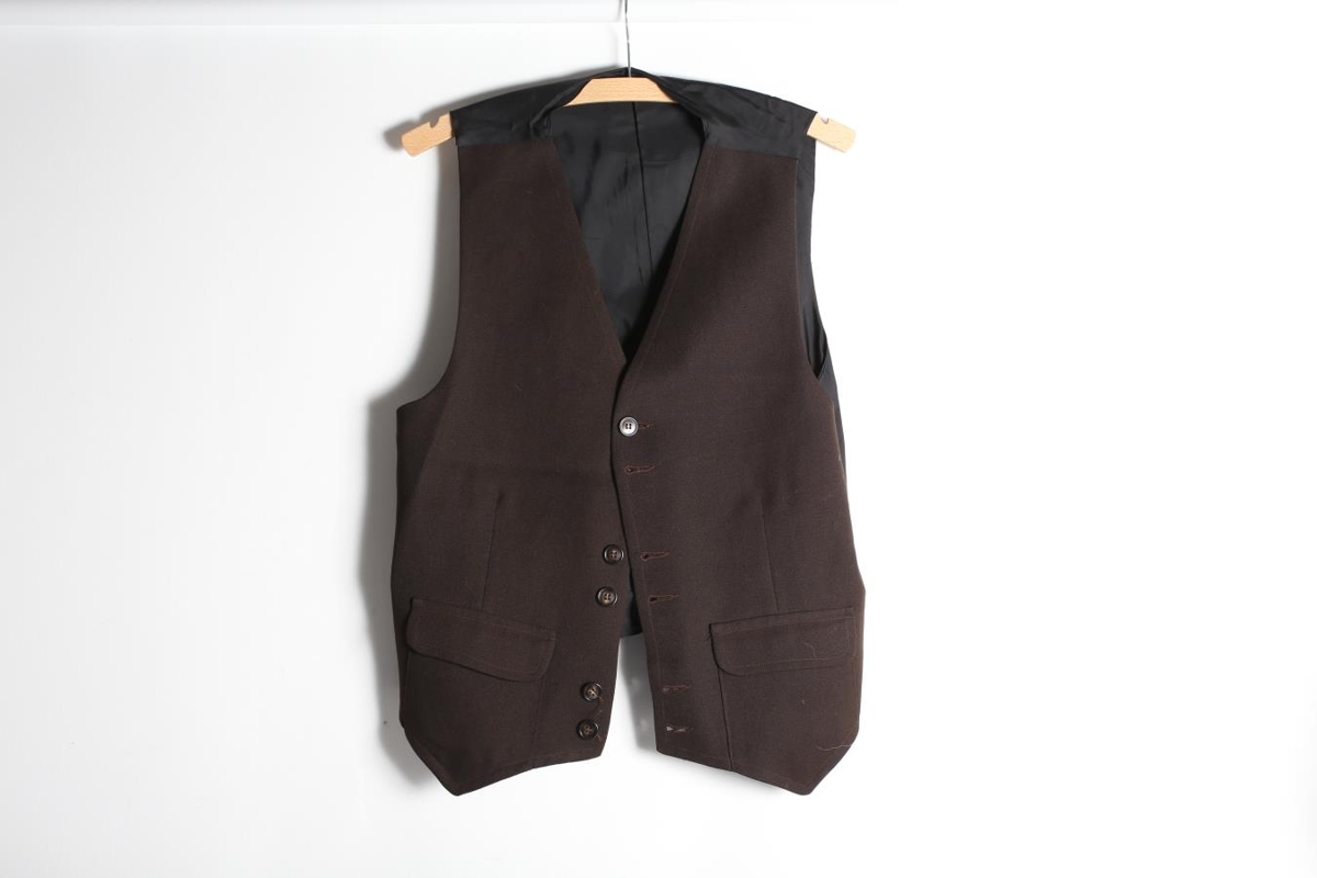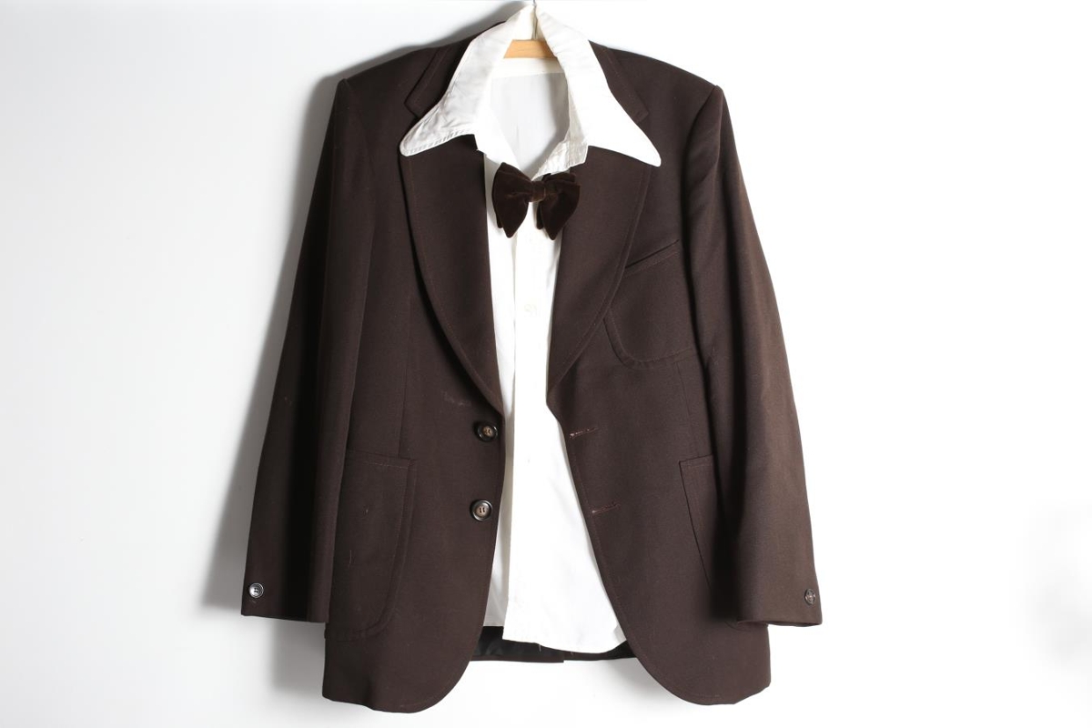 Brúnlituð ullarjakkaföt og hvít skyrta innanundir. Brúðkaupsjakkaföt Hlyns Halldórssonar, Miðhúsum.Jakkafötin samanstanda af tvíhnepptum jakka með þremur vösum, vesti, slaufu úr flaueli, buxum og skyrtu. Hlynur Halldórsson og Edda Björnsdóttir giftu sig 23. ágúst 1973.