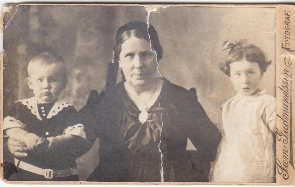 Aftan á myndina hefur verið skrifað nöfn þeirra sem á myndinni eru: Sveinn Jónasson, Helga Kristín Davíðsdóttir og Helga Magnúsdóttir.