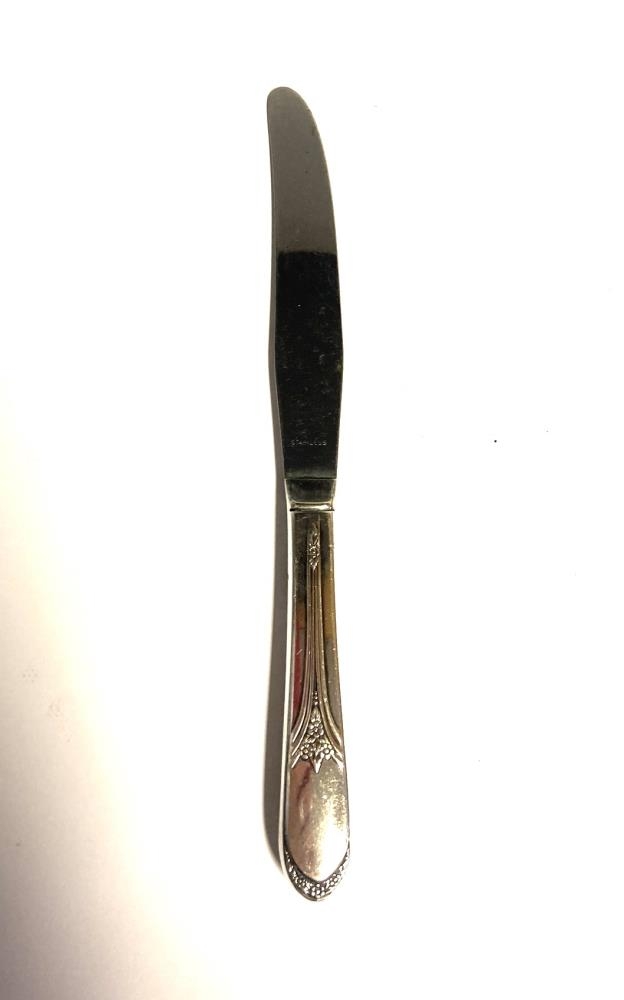 Mathnífur Þórunnar Jónsdóttur, silfurskeftur. "Stainless". Komið frá Blönduhlíð 7 í Reykjavík. Var varðveitt hjá Sveini Pálssyni,d 2003. Úr eigu Þórunnar Jónsdóttur ljósmóður frá Reynishólum, f. 1889, d. 1979.