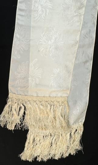 ljósu silki með íofnu samlitu blómamunstri.Það er með ljósu kögri