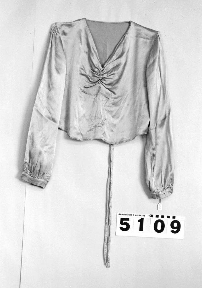 úr bláu silki. Með ísettum ermum og V-hálsmáli sem tekið er saman að framan.