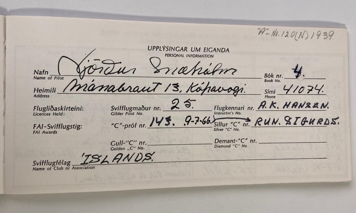 Logbók Njarðar H. Snæhólm, flugmanns og yfirrannsóknarlögregluþjóns í Reykjavík. Logbókin er dökkblá að lit og á henni stendur með silfurlituðum stöfum: "Flugdagbók Svifflugmanns" og "Svifflugfélag Íslands". Njörður var með svifflugmannsskírteini nr. 25 og logbókin er nr. 4. Síðasta færsla bókarinnar er skráð 4. júní 1994 en í bókina eru færðar skráningar úr eldri logbókum.