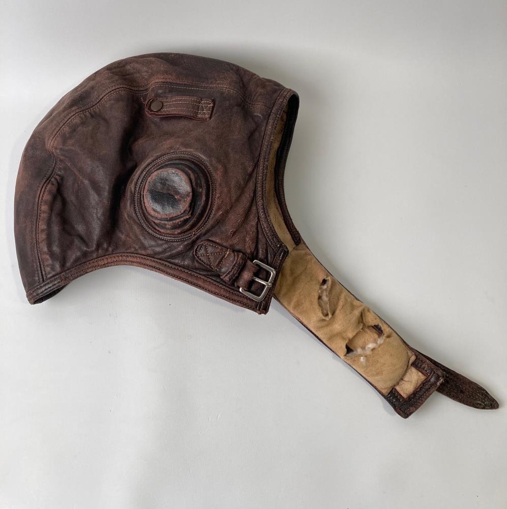 Flughetta, úr dökkbrúnu leðri og ljósbrúnu fóðri að innan. Flughettan er úr eigu Njarðar H. Snæhólm flugmanns og yfirrannsóknarlögregluþjóns.