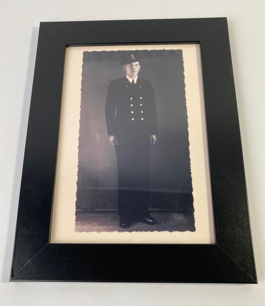 Ljósmynd í svörtum viðarramma. Ljósmyndin er af Nirði H. Snæhólm flugmanni og yfirrannsóknarlögregluþjóni. Á myndinni er Njörður klæddur einkennisbúningi Konunglega norska flughersins.