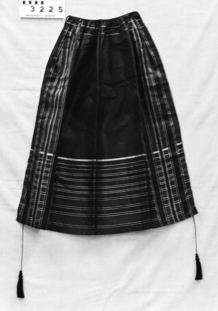 úr svörtu silki með bláum og hvítum röndum og bekkjum, fest um mittið með