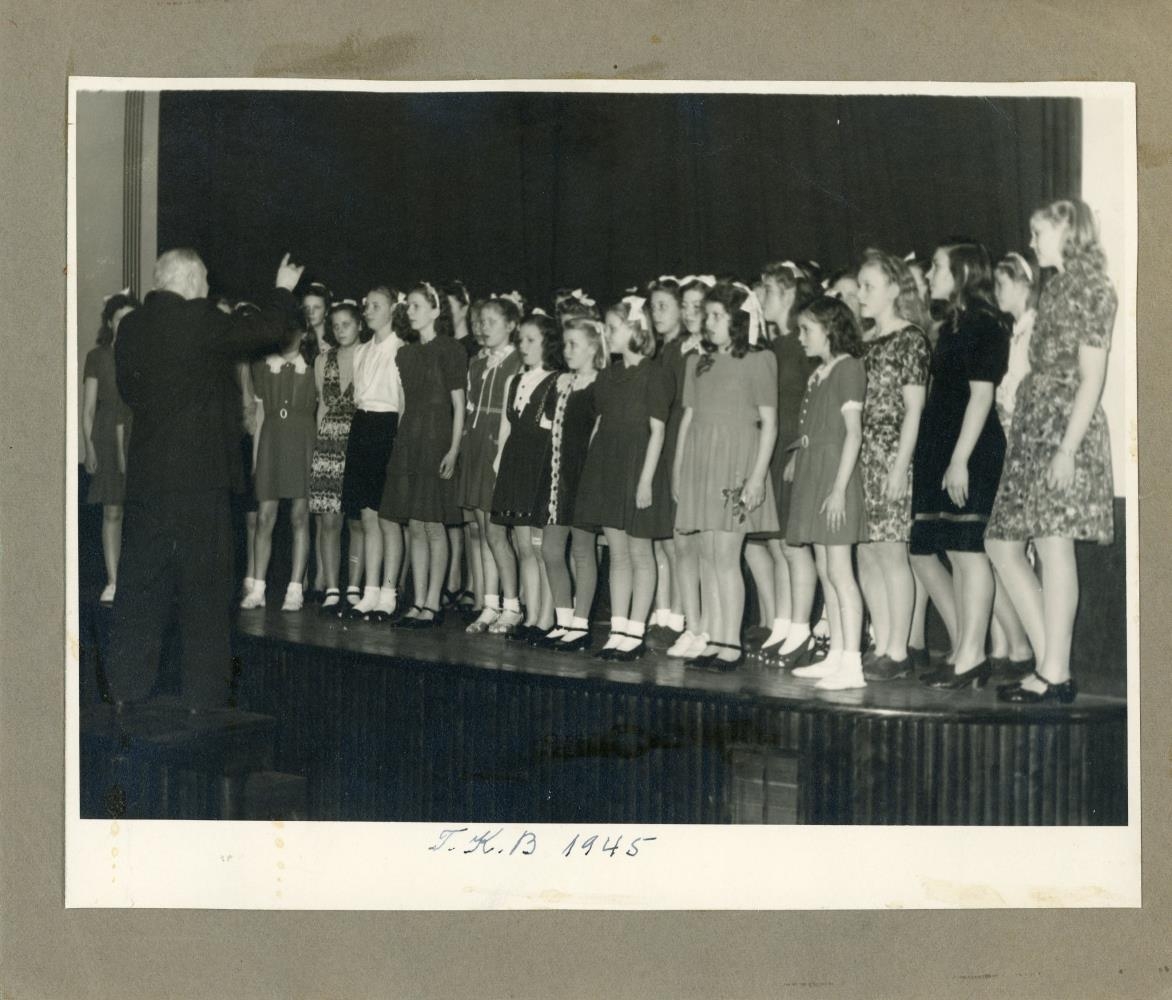 Stúlknakór syngur á sviði Bæjarbíós, hugsanlega undir stjórn Friðriks Bjarnasonar tónskálds. Stúlkurnar eru klæddar kjólum, sokkabuxum og lakkskóm en stjórnandinn í dökkum jakkafötum.