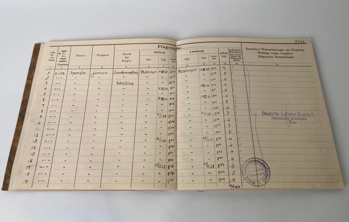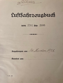 Logbók Sigurðar Jónssonar flugmanns, Sigga flug. Bókin er brúnmynstruð að lit, með brúnum kili. Logbókin er tekin í notkun 14. nóvember 1928.