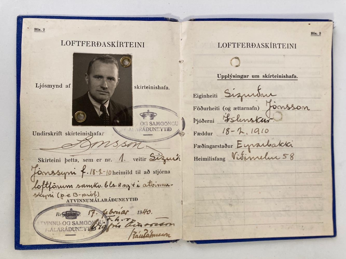 Loftferðaskírteini, flugskírteini Sigurðar Jónssonar flugmanns, Sigga flug. Skírteinið er blátt að lit og á því stendur með gylltum stöfum Loftferðaskírteini. Í skírteininu er passamynd af Sigurði. Skírteinið er gefið út af atvinnu- og samgöngumálaráðuneytinu 17. febrúar 1940. Skírteinið veitti Sigurði bæði leyfi til atvinnuflugs og flugkennslu.
