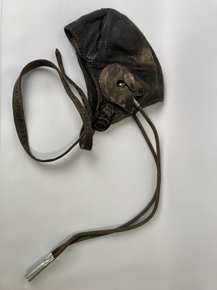 Flughetta úr eigu Sigurðar Jónssonar flugmanns, Sigga flug. Flughettan er úr brúnu leðri og er nokkuð snjáð.