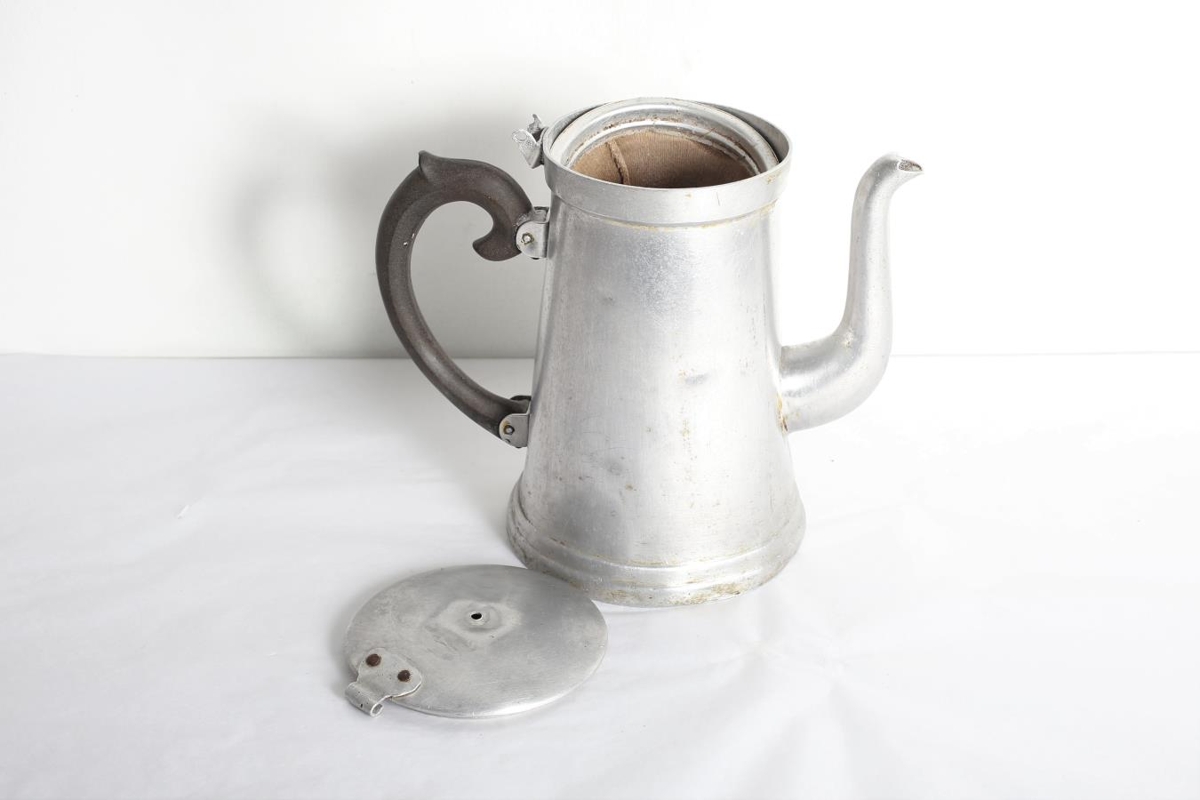 Grá kaffikanna úr áli með svörtu haldi úr plasti. Kaffifilter með álramma fylgir með og er settur ofan í könnuna. Kaffi sett þar í og heitu vatni hellt yfir. Lok úr áli hefur verið á könnunni en losnað af, og er hnappurinn sem hefur verið á lokinu einnig farinn. Gefið af börnum Steinunnar Guðnadóttur og Þórðar Stefáns Benediktssonar, Laugavöllum á Egilsstöðum.