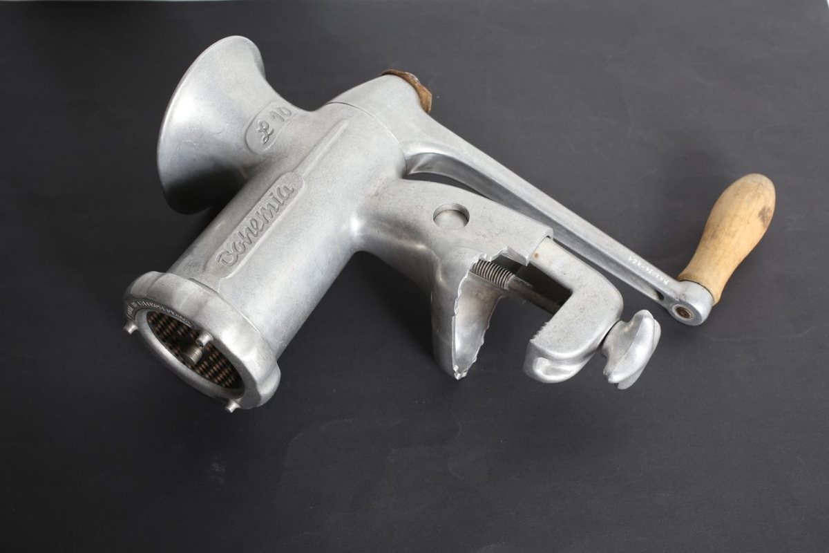 Handsnúin hakkavél úr járni af gerðinni Bohemia. Til að festa á borð. Sveifarhald er úr tré og hægt að skrúfa af framan á vélinni til að skipta um gataskífu, en engar skífur fylgja þó með. Gefið af börnum Steinunnar Guðnadóttur og Þórðar Stefáns Benediktssonar, Laugavöllum á Egilsstöðum.