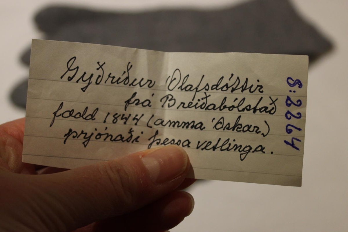 Fingravettlingar, gráir. Gyðríður Ólafsdóttir frá Breiðabólsstað, amma Óskar, prjónaði þá. Gyðríður var fædd 1844. Ósk dó 8.6.2000. Hún giftist ekki. Var í kvennaskóla 1925. Afhent af Elínu Pálsdóttur frá Steinum (Hvassafelli) u. Eyjafjöllum, úr dánarbúi Magneu Óskar Gísladóttur (f. 1904). Foreldrar: Gísli Gislason silfursmiður frá Rauðabergi og Margrét Sigurðardóttir frá Breiðabólstað.