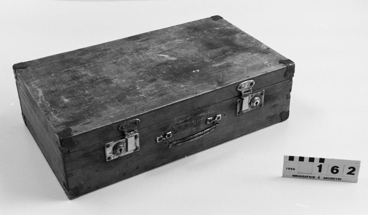 úr furu, geirnegld á hornum og járnklædd á hornum. Læsingar úr járni