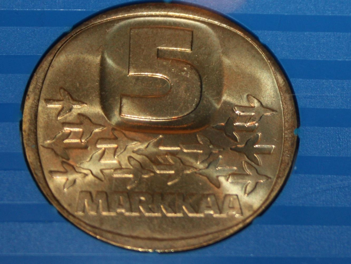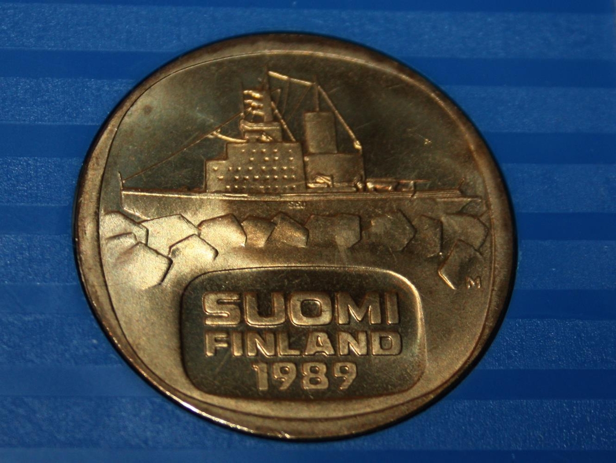 Sex myntir og einn minnispeningur á spjaldi í öskju.