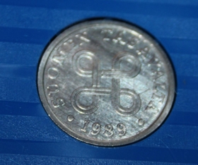 Sex myntir og einn minnispeningur á spjaldi í öskju.