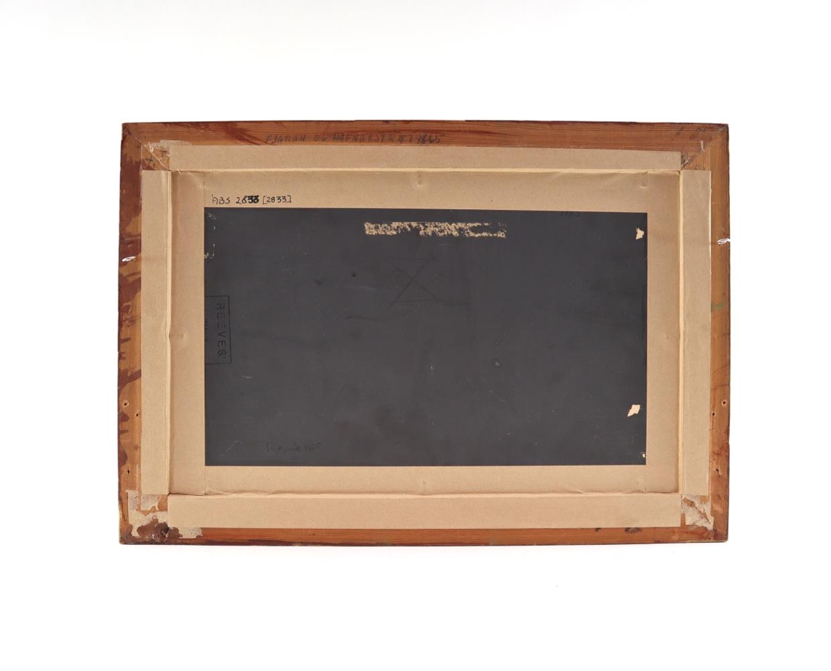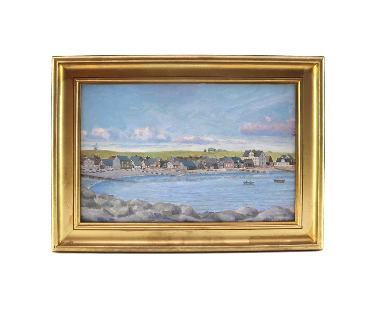 Málverk eftir Jón Helgason: Reykjavíkurfjara og Hafnarstræti 1865/1866. Olíulitir á pappa í gyltum viðarramma.