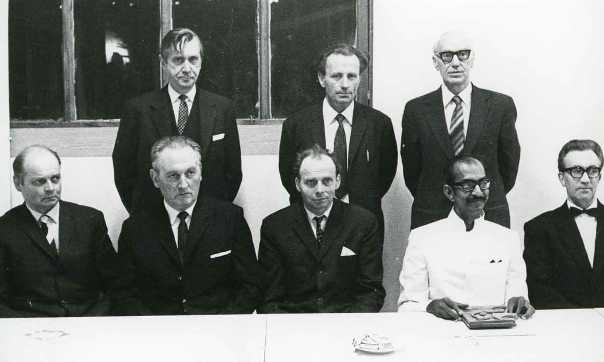 Hópur 8 manna stilla sér upp fyrir myndatöku við borð, þrír standa í bakgrunni, fimm sitja við borðið. Á bakvið mennina er ljós veggur með fjórföldum dekkri glugga.