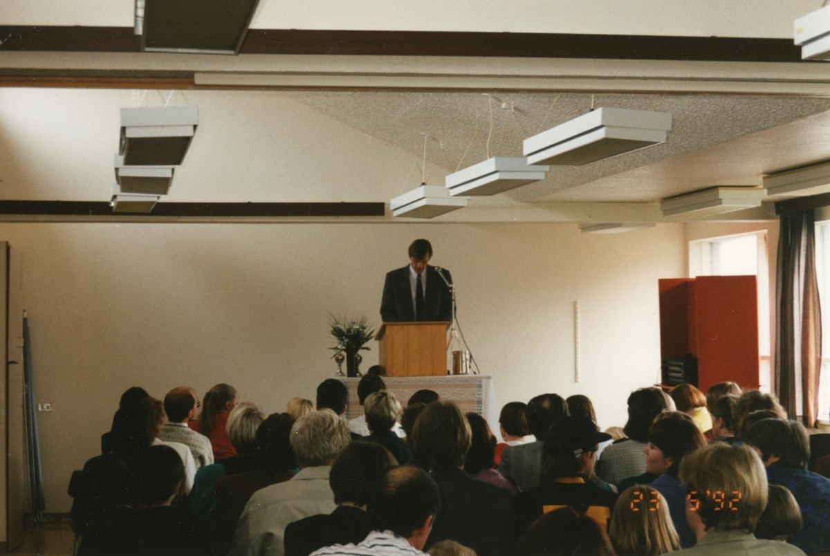 Skólaslit Laugaskóla 23. maí 1992. Kristján Gíslason skólastjóri í ræðupúlti.