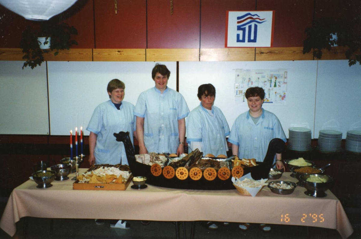 Starfsfólk í mötuneytinu frá vinstri. Guðlaug Einarsdóttir í Efri-Múla, Arndís Erla Ólafsdóttir í Ásgarði, Guðrún Aðalheiður Aðalsteinsdóttir (Lilla) í Hofakri og Þuríður Jóney Sigurðardóttir í Lyngbrekku.