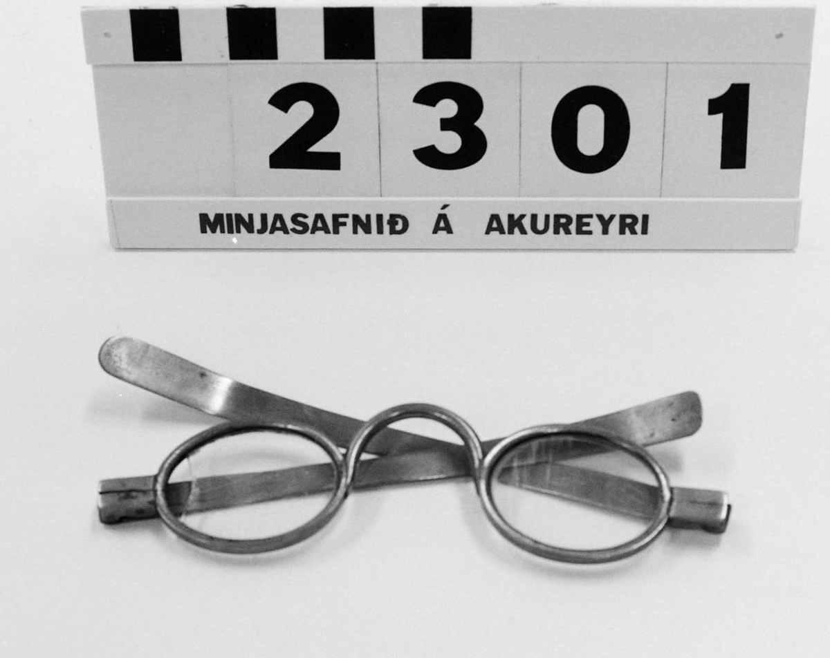 í messingumgjörðum. Glerin eru sporöskjulöguð og lítið eitt brotið