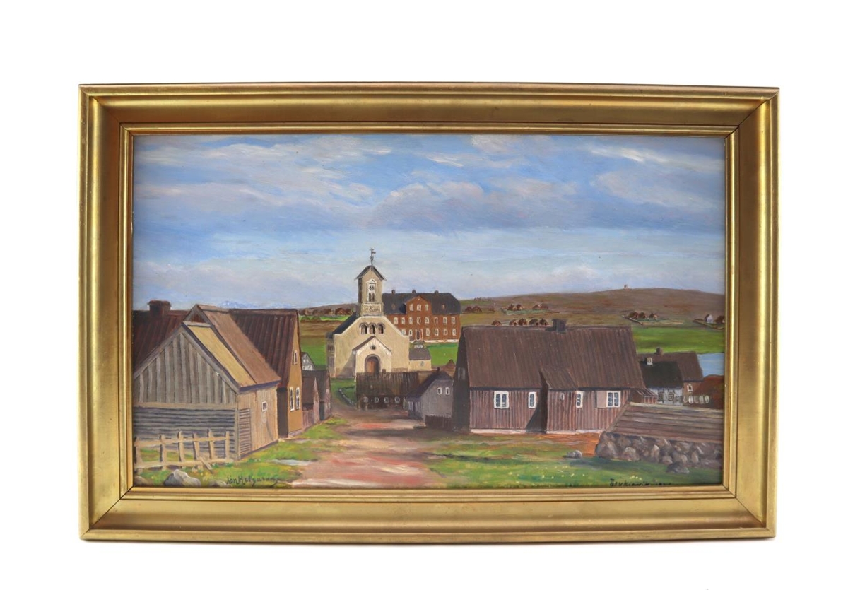 Málverk eftir Jón Helgason: 1. Túngata um 1850. Olíulitir á pappa.