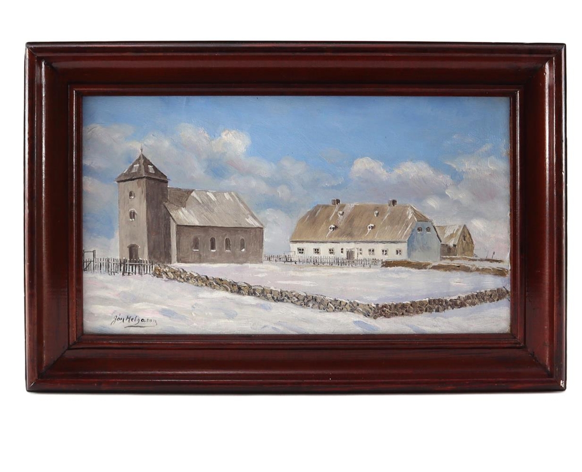 Æviágrip: Jón Helgason biskup var fæddur 21. júní 1866 að Görðum á Álftanesi. Tveggja ára gamall fluttist hann til Reykjavíkur ásamt foreldrum sínum, þeim Helga Hálfdánarsyni prestaskólakennara og Þórhildi Tómasdóttur. Að loknu stúdentsprófi 1866 sigldi hann til Kaupmannahafnar til guðfræðináms. Meðfram náminu fylgdi hann ráðleggingum föður síns og kynnti sér fagrar bókmenntir. Jafnframt segir Jón í ævisögu sinni: "En svo var annað, sem ég var sérstaklega hneigður fyrir og hafði verið það frá æsku, sem ég nú varði mörgum tómstundum til að iðka, en það var dráttlist. Mjög snemma Hafnarveru minnar hafði ég tekið að venja komur mínar á myndasöfn borgarinnar ... Þetta varð aftur til þess, að hjá mér vaknaði löngun til þess að fá tilsögn í dráttlist hjá góðum kennara og þar kom, að ég keypti mér tilsögn hjá norskum málara ... Louis Moe að nafni. ... Er mér óhætt að segja, að ég hefi aldrei iðrast þeirrar tafar frá lestrinum, sem af þessu leiddi, því að þótt mig aldrei hafi dreymt neina listamannsdrauma, þá hefir þetta dráttlistar-sýsl mitt búið mér fjölda ánægjustunda á ævinni, þótt aldrei yrði úr því annað en hjáverka-sýsl viðvanings.’’ Árin líða, Jón lýkur námi og flytur til Íslands. Gerðist hann fyrst kennari í prestaskólanum en var síðan kosinn biskup árið 1917. Meðfram störfum sínum gaf hann sér iðulega tíma til að teikna og mála. Hann dregur upp nákvæmar myndir af Reykjavík og kirkjum landsins. Lítið hefur verið skrifað um myndir Jóns Helgasonar og kannski hefur fólk hneigst til að líta á þær sem sagnfræðilegar heimildir fyrst og fremst. Jón Helgason lést í Reykjavík árið 1942 eftir langt og farsælt ævistarf.