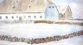 Málverk eftir Jón Helgason: Bessastaðir 1892. Olíulitir á pappa.