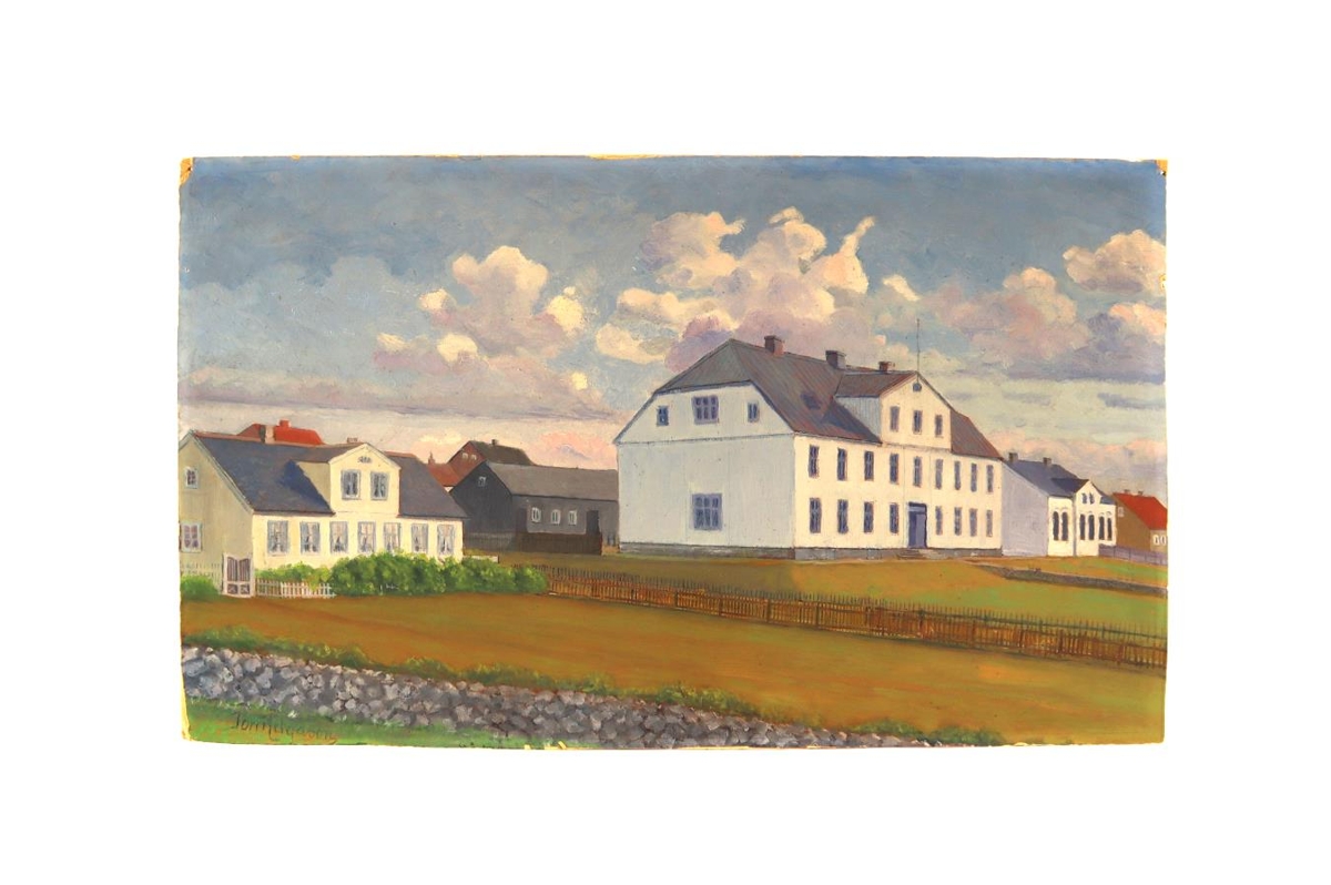 Málverk eftir Jón Helgason: Latínuskólinn um 1894. Olíulitir á pappa. Myndin er án ramma. Ljósmyndin sem fylgir færslunni er tekin af ljósmynd.