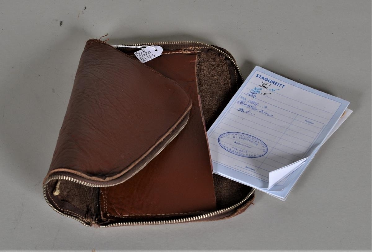 Seðlaveski hannað og saumað af Jóni Stefánssyni, í því eru staðgreiðslunótur.