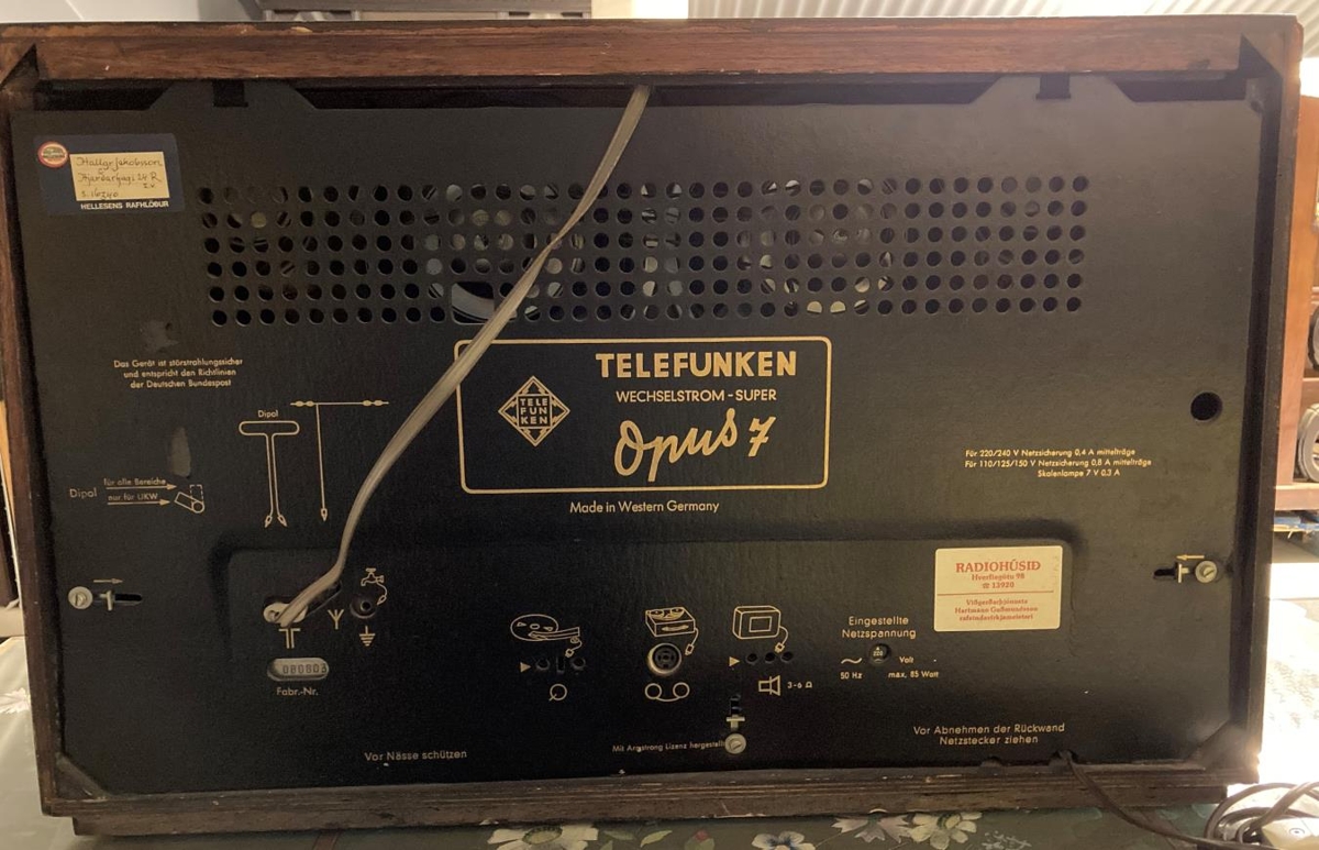 Útvarpstæki. Telefunken, Opus 7. Made in Western Germany, árgerð 1956-57. Merkt á límmiða Hallgrímur Jakobsson Hjarðarhagi 24, R. I. V. S 16340. Hallgrímur Jakobsson var fæddur á Húsavík 23.7.1908 dáinn í Rvk 16.3.1976. Hann var sonur Jóns Jakobssonar og Valgerðar Pétursdóttur. Þau áttu 7 börn. Fluttu til Kanada í nokkur ár 1913-1920 og voru með föðurnafnið Jakobsson eftir það. Hallgrímur kvæntist 1937 Margréti Árnadóttur frá Látalæti (Múla) í Landsveit. Þau eignuðust fimm börn: Hrafn, Guðrún, Jakob, Jón Ármann og Valgerður. Hallgrímur lauk gagnfræðaprófi frá Mennaskólanum í Reykjavík 1926, var í Tónlistaskólanum 1930-31 og lauk söngkennarprófi þaðan 1938. Kenndi í Austurbæjarskóla frá 1945 til dauðadags. Var kórstjóri ýmissa kóra og áhugamaður um framgang esperanto. Bjó í kennarablokkini á Hjarðarhaga 24. (heimild: Íslendingaþættir Tímans 25. Tbl. 17.07.1976)