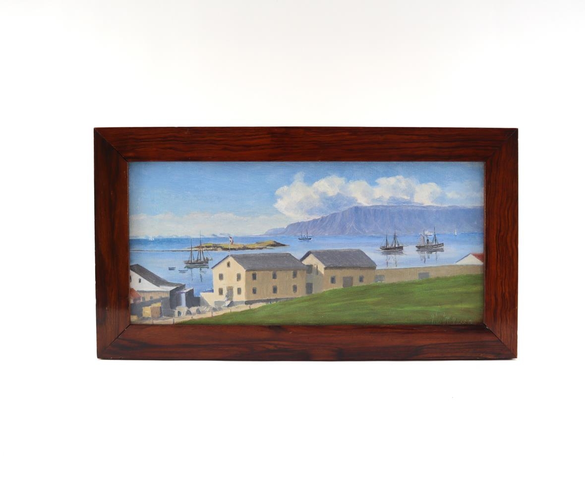 Málverk eftir Jón Helgason: Timburverzlun við Kalkofnsveg. Olíulitir á striga.