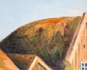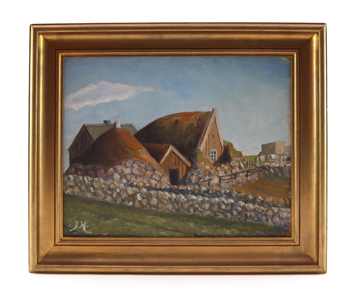 Málverk eftir Jón Helgason: 8. Austasti Melshúsabærinn. Olíulitir á léreft (límt á tré).
