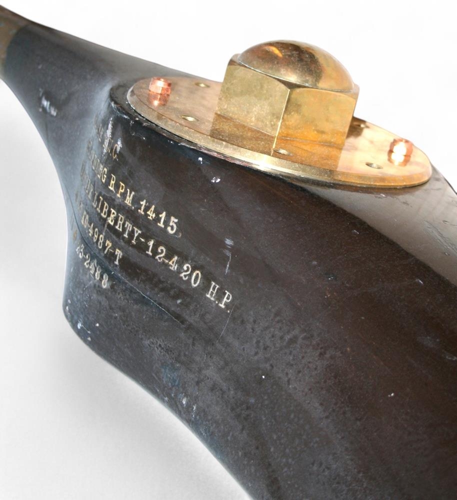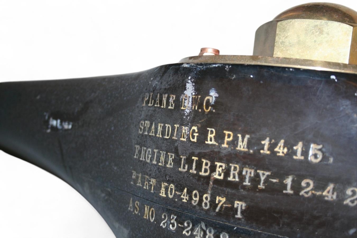 Flugvélarspaði. Úr samlímdum tréflögum, með messingrörum til enda og öxulhaus úr kopar. 306 sm langur och 18,5 sm breiðastur um öxul. Áletraður til minningar um hnattflug Nelsons 1924 við komu í Reykjavíkurhöfn 3. ágúst 1924. Áletrun: Hnattflug Nelsons 3. ágúst 1924.