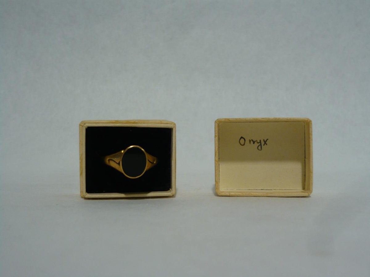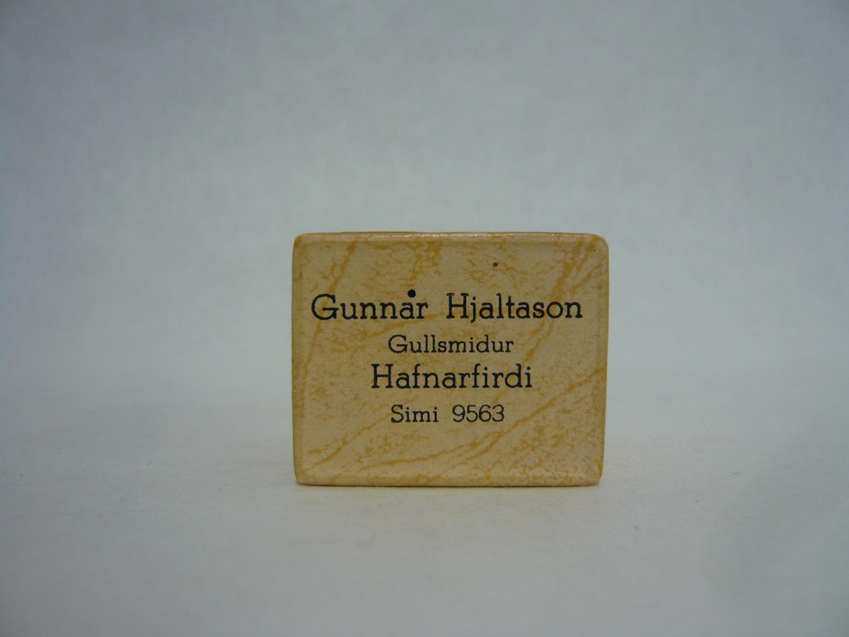Hringurinn er grannur með svörtum flötum steini. þvermál að innanmáli er um 1,9 cm. Hann er í upphaflegum umbúðum, litlum ljósum kartonstokk, og á loki hans stendur: GUNNAR HJALTASON GULLSMIÐUR HAFNARFIRÐI, SÍMI 9563.
