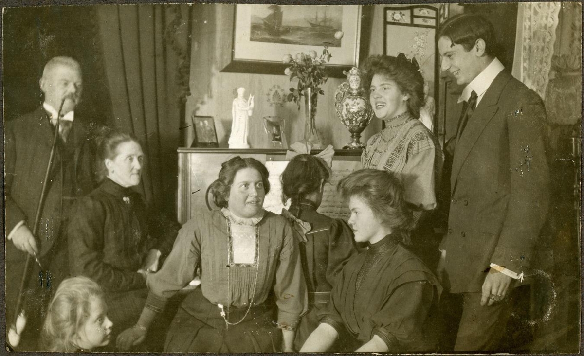 „Frá vinstri: Th. Thorsteinsson 1856-1924, Kristjana Geirsdóttir Zoega 1864-1933, neðst til vinstri, og tvær frá hægri líklega dætur þeirra: Hildur, Sigríður, Guðrún og Emelía. kona fyrir miðju ókunn, karl til hægri ókunnur. Myndin er tekin á heimili Th. og Kristjönu.“ (PBB 2025)