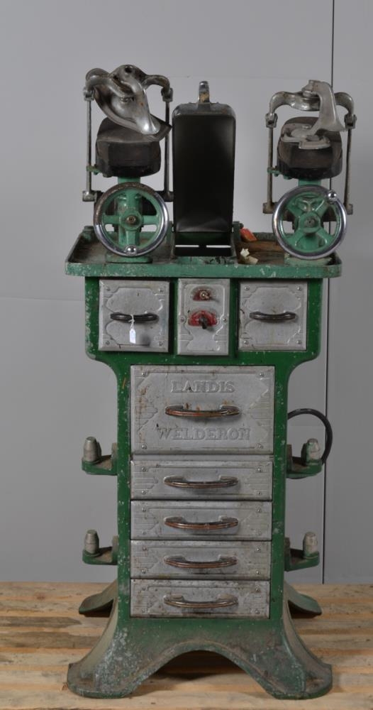 Landis welderon model A skóviðgerðarlímpressa, hitavél, leistur og fylgihlutir. Fylgihlutir eru í nokkkrum skúffum.