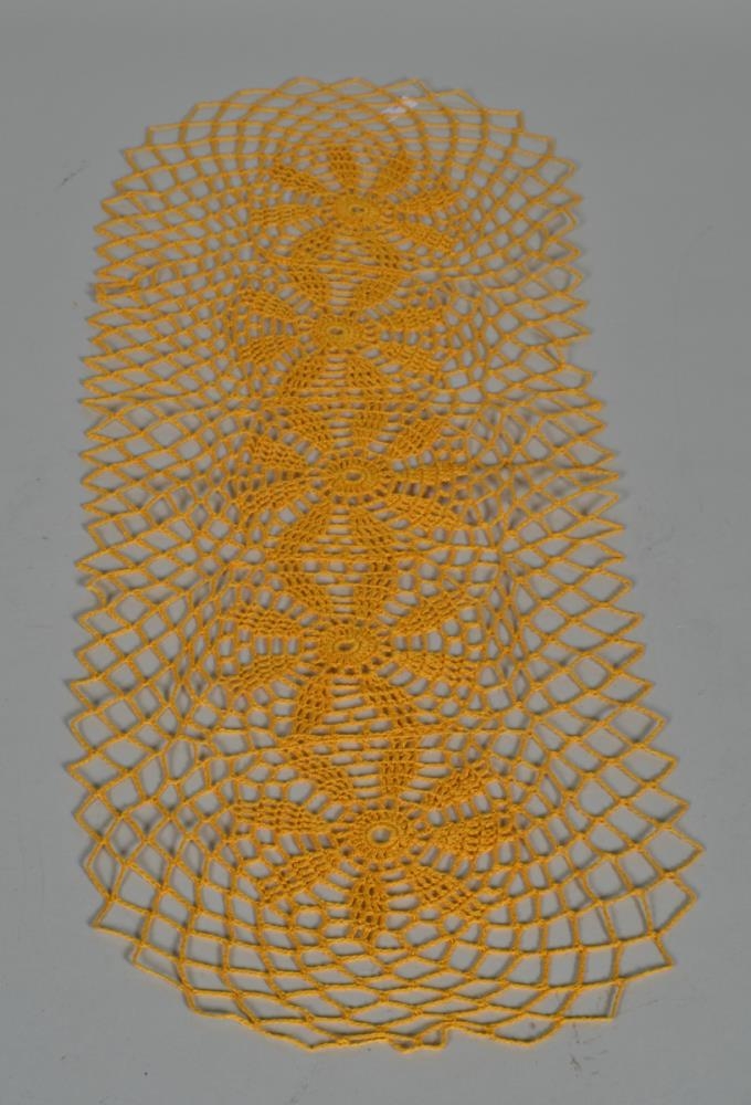 Heklaður dúkur til skrauts á borðum eða hillum, gulur að lit.