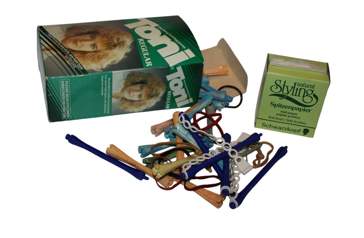 Permanett-rúllur, teygjur, blöð í öskju til að leggja á milli hárs og rúllur. Er geymd í "Toni regular" kassa.